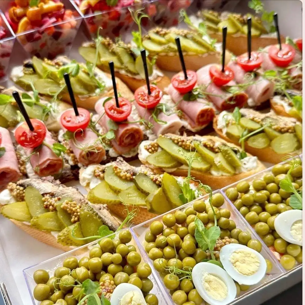 Салат «Оливье» 5 шт Салат «Винегрет» 5 шт Брускетта со шпротами 10 шт Канапе с грудинкой 10 шт