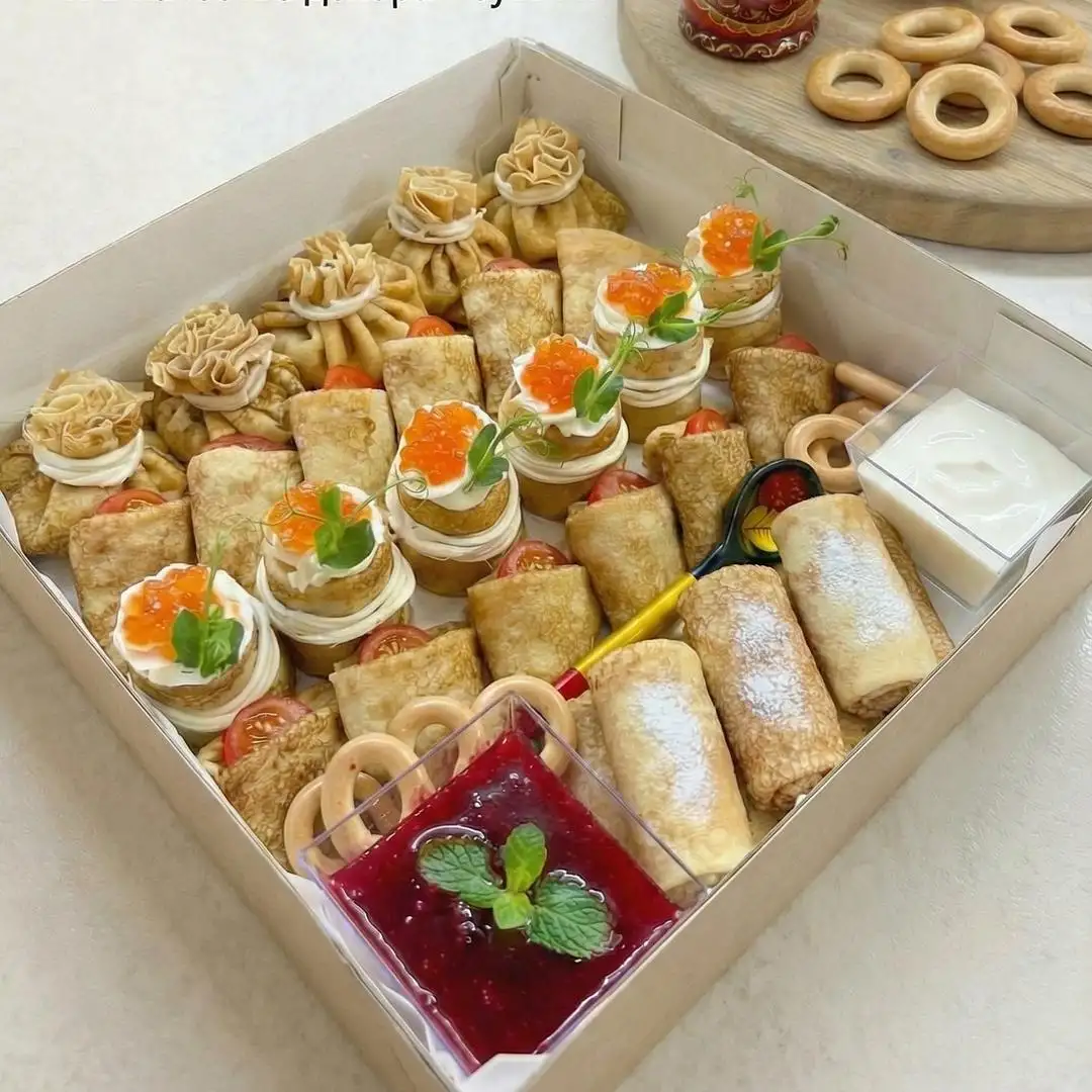 4 начинки: — блинчики с маслом — мешочки с яичной начинкой — треугольники с картофелем и беконом — бочонки с красной рыбой и икрой (имитация) в дополнение идут стаканчики с вареньем и сметаной декор — сушки
