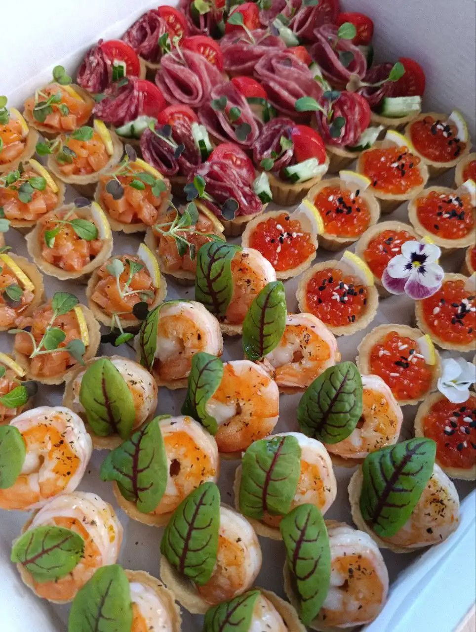 Ассорти из 16 миниатюрных песочных корзинок с четырьмя видами начинок: салями, икра, креветки, форель. Элегантный и удобный формат для фуршета, прекрасно дополняет шампанское. Каждая тарталетка — это яркий вкусовой акцент и изысканное угощение. Состав: тарталетки с салями, икрой, креветками, форелью (по 4 шт. каждого вида, всего 16 шт.).