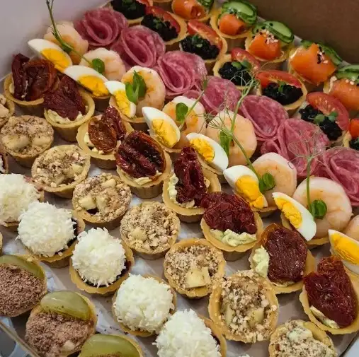 Тарталетка с творожным сыром и форелью 8 шт Тарталетка с икрой и черри 8 шт Тарталетка с креветкой и яйцом 8 шт Тарталетка с творожным сыром и салями 8 шт Тарталетка с голубым сыром с плесенью, медом и орехом 8 шт Тарталетка с вяленым томатом 8 шт Тарталетка с черничным джемом и какосом 8 шт Тарталетка с сладким кремом, шоколадом и виноградом