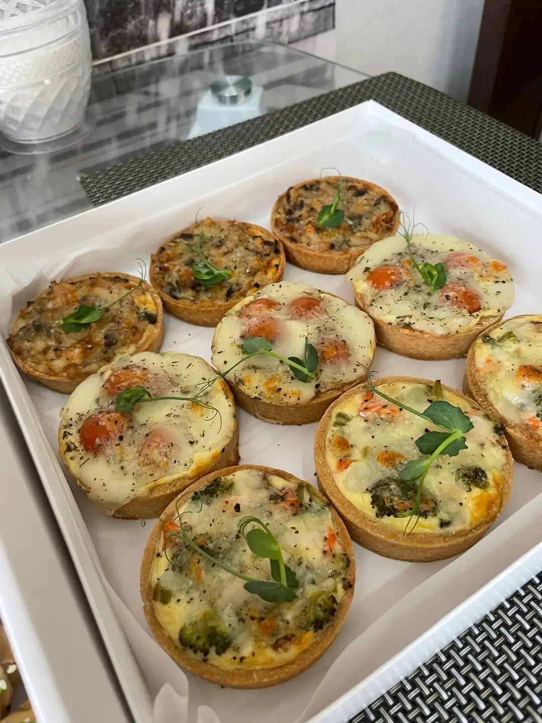 3 шт с форелью и броколли 3 шт с томатами черри и моцареллой 3 шт с копченым беконом и грибами