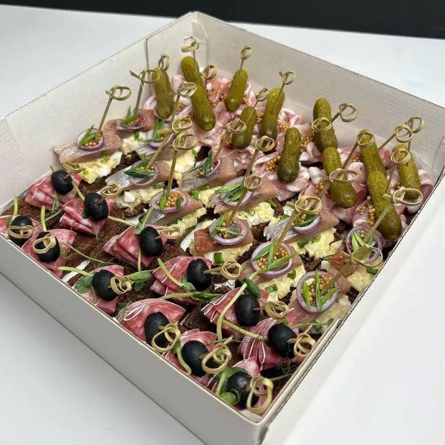 бекон/корнишон — 12 шт сельдь/салат — 12 шт сальчичон/маслина — 12 шт