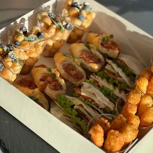 В состав бокса входит — профитроли с карамелью и ягодами — сырные палочки — мини пицца с салями — тортилья