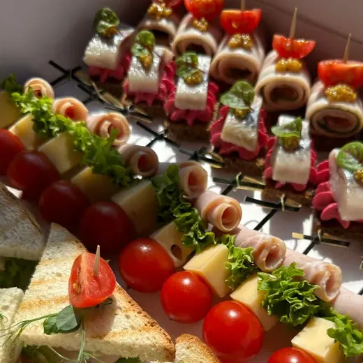 Бокс из 32 закусок Состоит из : - канапе с беконом 8шт - канапе на черном тосте с муссом из свеклы с сельдью 8шт -канапе на шпажке карбонад/черри/сыр 8шт -мини сэндвичи 8шт