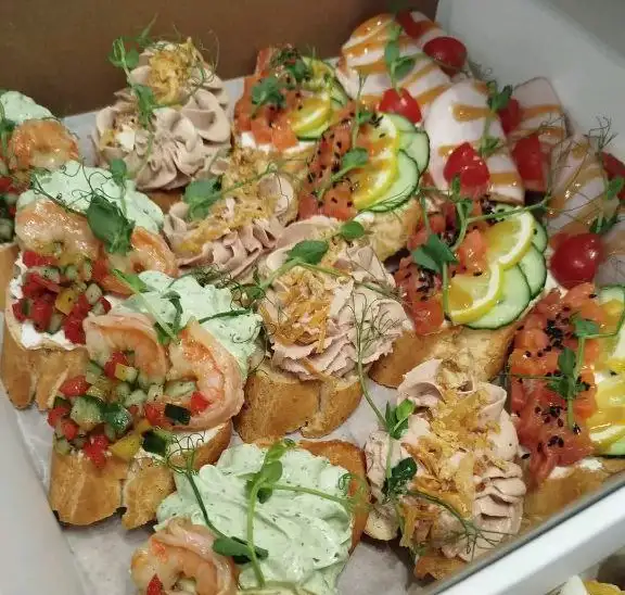 Брускетты с карбонатом, с форелью, с паштетом из фуагра с жареным луком, с креветками на базиликовом муссе. Вес — около 1 кг. 4 вида брускетт по 4 штуки
