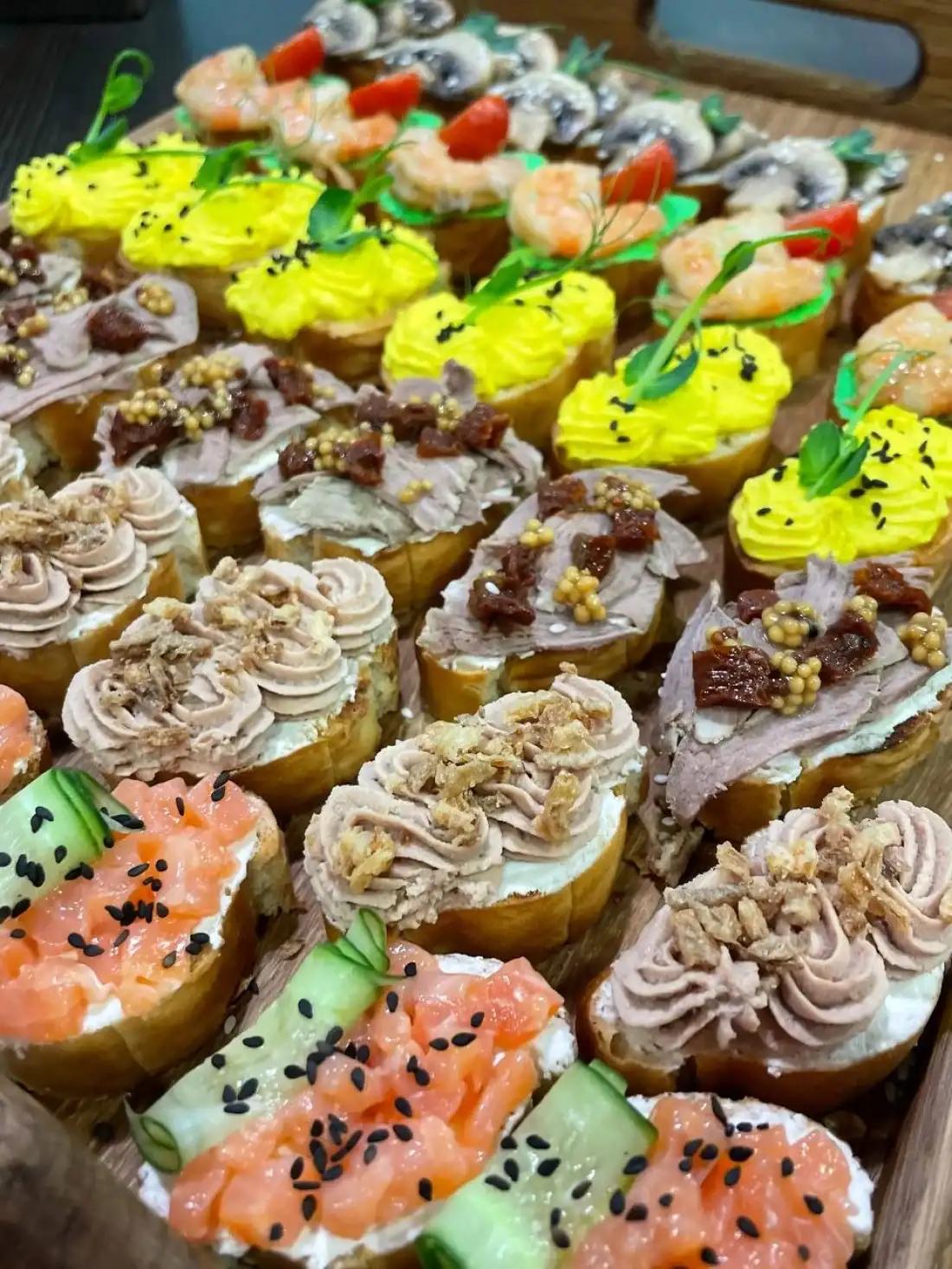 — Кростини с пассированными шампиньонами и творожным сыром 6 шт — Кростини с муссом из авокадо, королевской креветкой и томатом черри 6 шт — Кростини с паштетом (французский с яблоком) и жареным луком 6 шт — Кростини с слабосоленой форелью, творожным сыром и огурчиком 6 шт — Кростини с бужениной (говядина), вяленными томатами, французской горчицей 6 шт