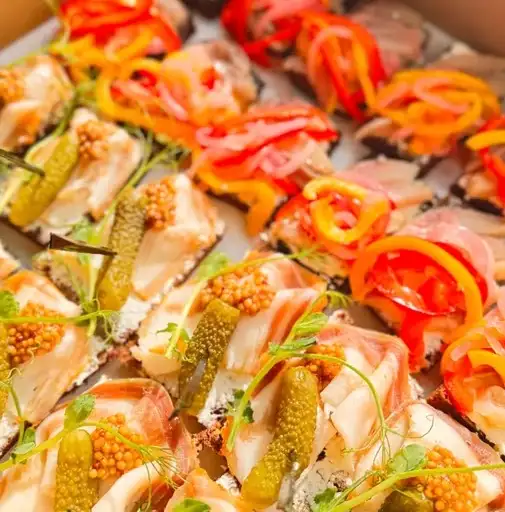 Бородинский хлеб, сельдь, перец болгарский, лук. Бородинский хлеб, грудинка, маринованный огурец.