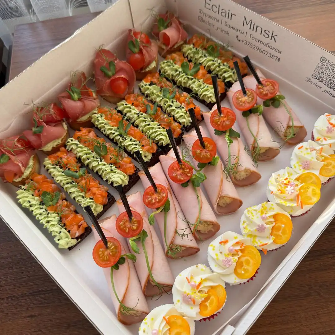 Состав: 1. Рулетики из карбонада с сыром — 8 шт 2. Брусочки из ржаного хлеба с лососем и петрушка муссом — 8 шт 3. Мини капкейки Красный бархат с домашней соленой карамелью — 7 шт 4. Кростини с прошутто (с/к шейкой), черри на сырной подушке с зеленью — 6 шт На 4−6 человек!
