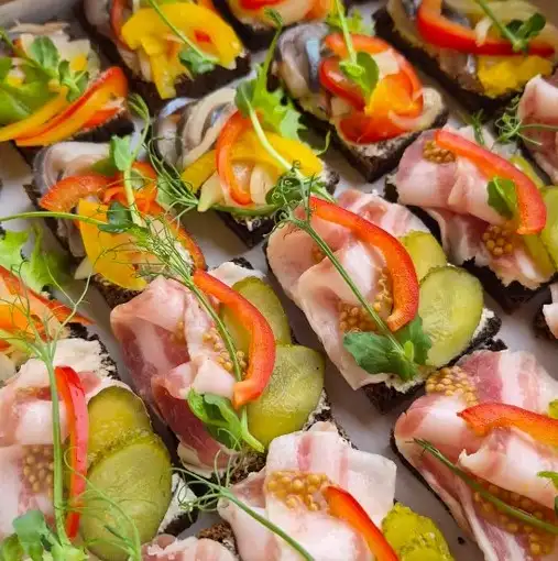 Канапе на черном хлебе с селедочкой и маринованным перцем с луком 10 шт Канапе на черном хлебе с грудинкой и саленым огурчиком 10 шт
