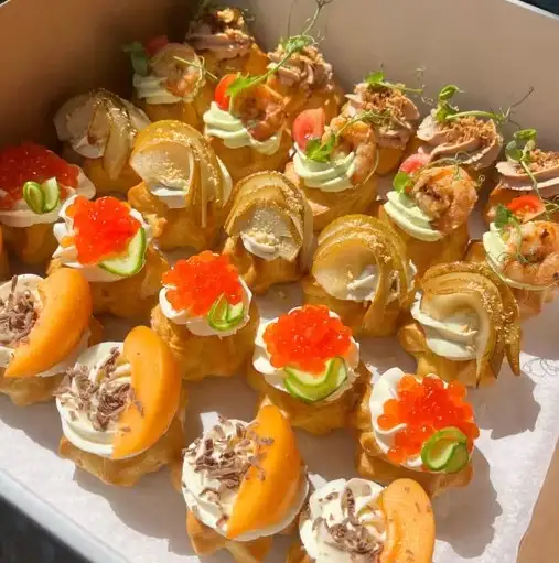 Легкие и воздушные профитроли собственного приготовления. Бокс состоит из пяти видов профитролей с начинкой. 1 — с творожным сыром, базиликом, обжаренными креветками, микрозелень 2 — с творожным сыром, сыром дор блю, запеченой грушей с добавлением меда и орехами 3 — с творожным сыром, икрой (имитация) и огурцом 4 — с куриным паштетом (или печеночным), луком и микрозеленью 5 — с крем-чизом и ягодами