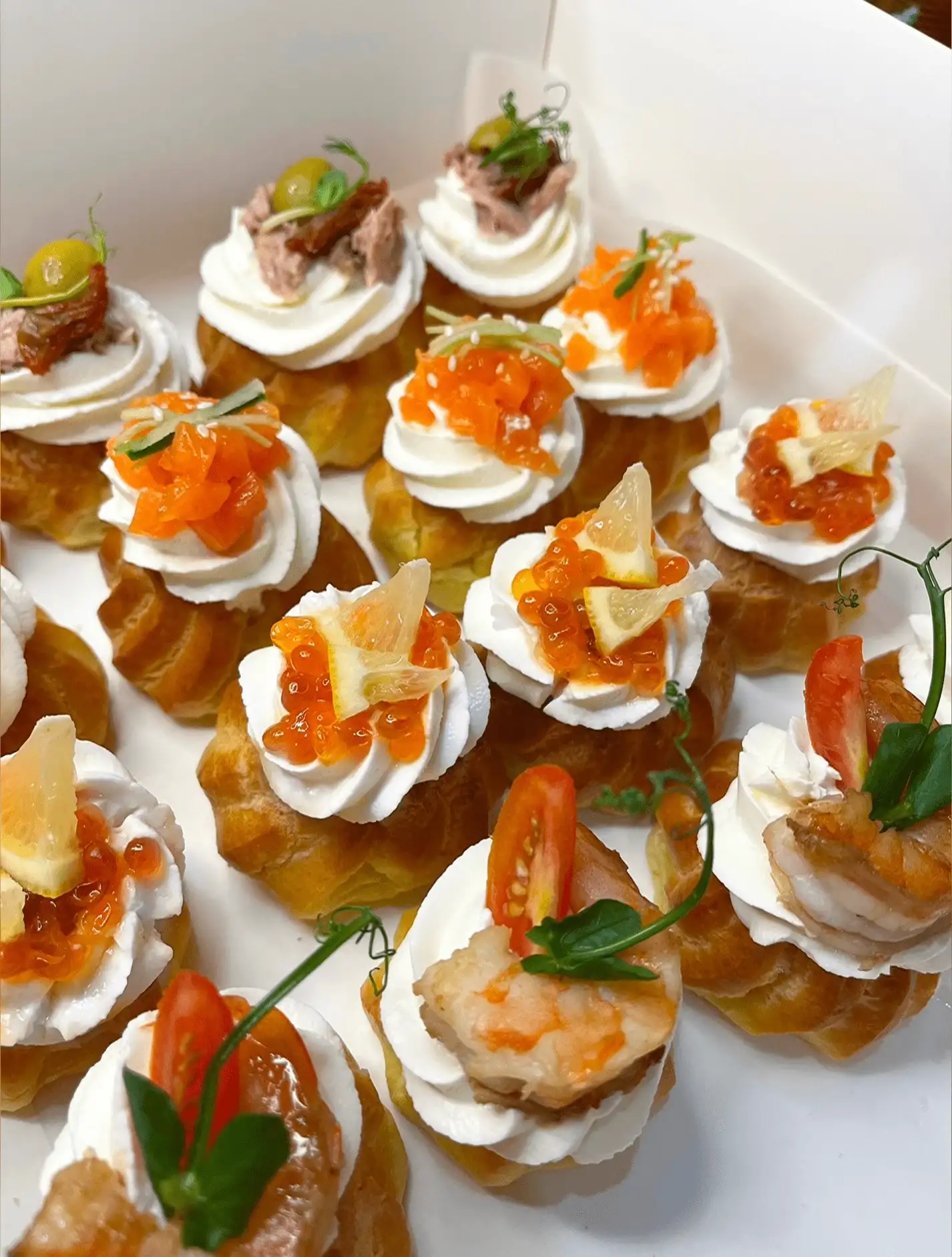 Cостав: Профитроли с тунцом, оливкой и вяленым томатом Профитроли с лососем, огручиком и кунжутом Профитроли с красной икрой и лимоном Профитроли с обжаренной креветкой и черри Стоимость: М — 90 р Сет на компанию из 2-3 человек Вес: 600 г — 16 шт L — 118 р Сет на компанию из 3-4 человека Вес: 1000 г — 24 шт XL — 135 р Сет на компанию из 5-6 человек Вес: 1400 г — 32 шт