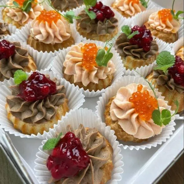 Паштеты: ✅ крабовый с красной икрой (крабовое мясо, творожный сыр, чеснок, майонез) ✅ творожно-мясной мусс и брусничный соус (творожный сыр, паштет мясной, соус с натуральной брусникой)