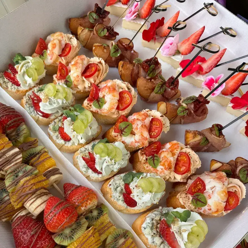 Брускетта с томатной креветкой Тоскано — 6 шт Брускетта с дор блю ягодами и орехами — 6 шт Канапе бри с клубникой — 8 шт Канапе груша с хамоном (прошуто) и вялеными томатами — 8 шт Канапе фруктовое (клубника, банан, апельсин, киви) — 6 шт