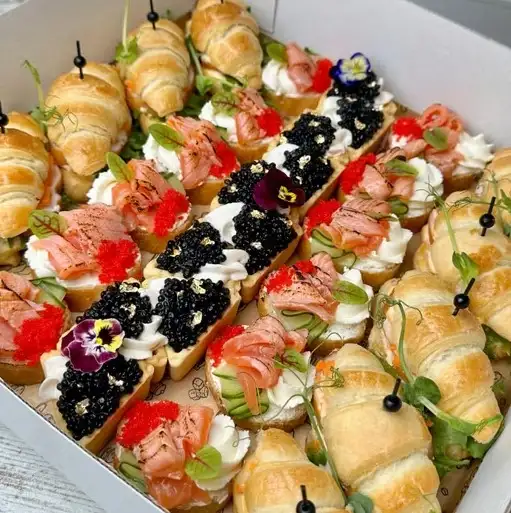 — круассаны с копченой грудкой — кростини с опаленым лососем — тарталетки с икрой палтуса