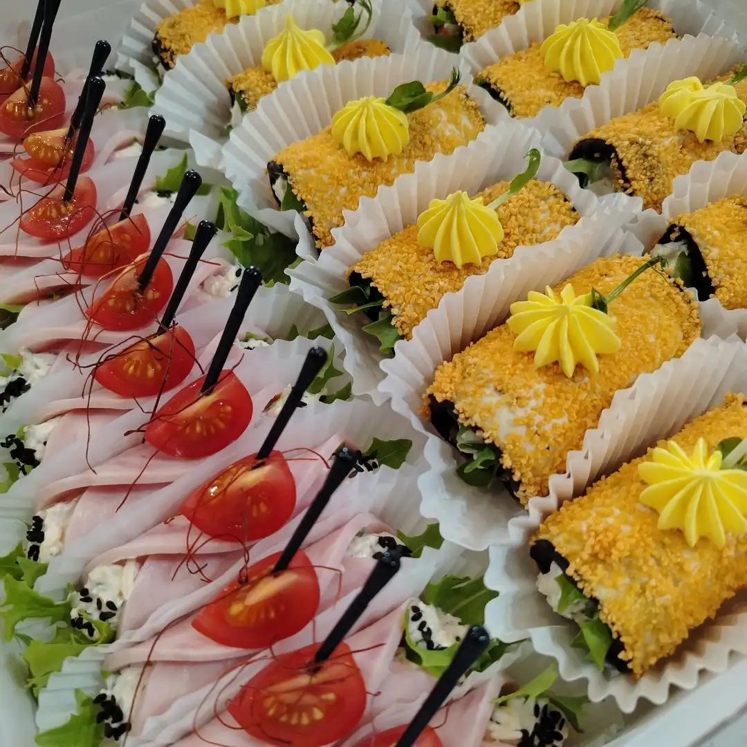 Рулетики из баклажан с сырно-ореховой начинкой — 12 шт Рулетики из ветчины с сырно-чесночной начинкой — 12 шт