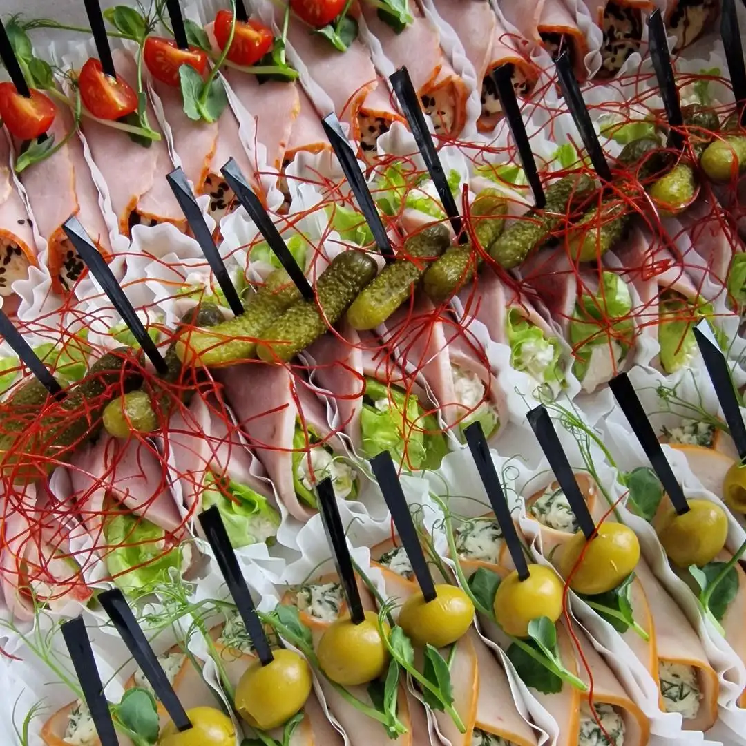 3 вида 1. Рулетики из карбонада с томатами черри 12 шт. — 36 руб. 2. Рулетики из ветчины с маринованым огурчиком и перцем 12 шт. − 38 руб. 3. Рулетики из ветчины с перепелиным яйцом 12 шт. — 36 руб.