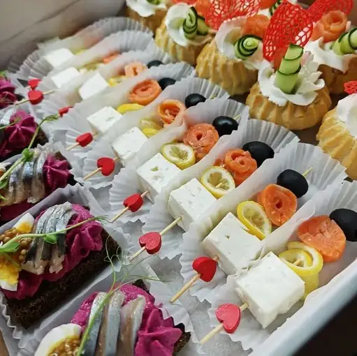 10 профитролей с форелью и огурчиком 5 брускетт на домашнем Бородинском с селедочкой 10 канапе с форелью, оливкой, лимоном и сыром