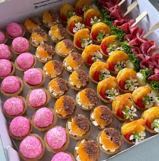 1. Мини-тарталетки с кокосовым шариком и джемом, 16 шт 2. Мини-тарталетки с сладким крем чиз и ягодой, 16 шт 3. Мини-тарталетки с креветкой, 16 шт 4. Канапе чиз бол и колбаска, 10 шт