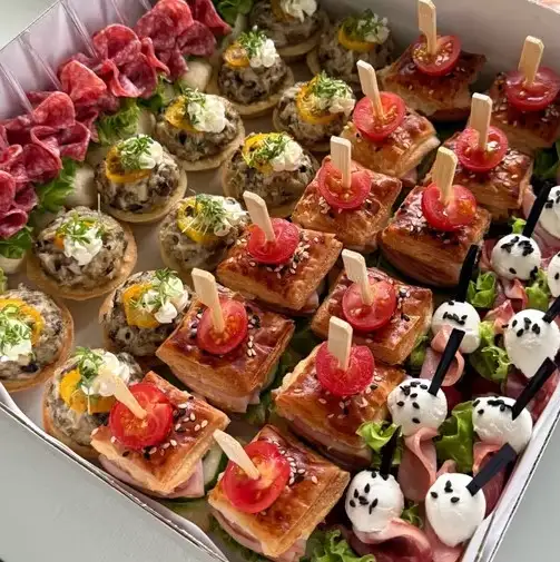 1. Канапе чиз Бол с колбаской 10 штук 2. Тарталетки с курицей и грибами 12 штук 3. Слойки с ветчиной и ореховом соусом 12 штук 4. Канапе cherry моцарелла колбаска салат 10 штук