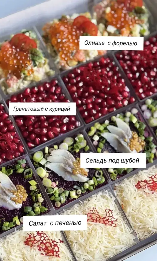 Состав: — Оливье с форелью — Гранатовый с курицей — Сельдь под шубой — Салат с печенью Мин. заказ 1 вида — 6 шт.