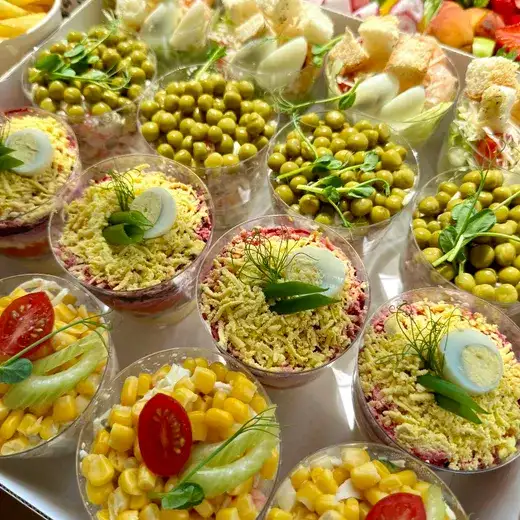 Виды салатов : 1. Крабовый 4 шт. 2. Селёдка под шубой 4 шт. 3. Оливье 4 шт. 4. Гавайский с ананасами 4 шт.