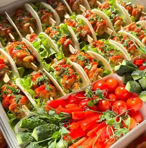 — Шашлычки с перцем, 25 шт. — Два лоточка с овощами и соусом