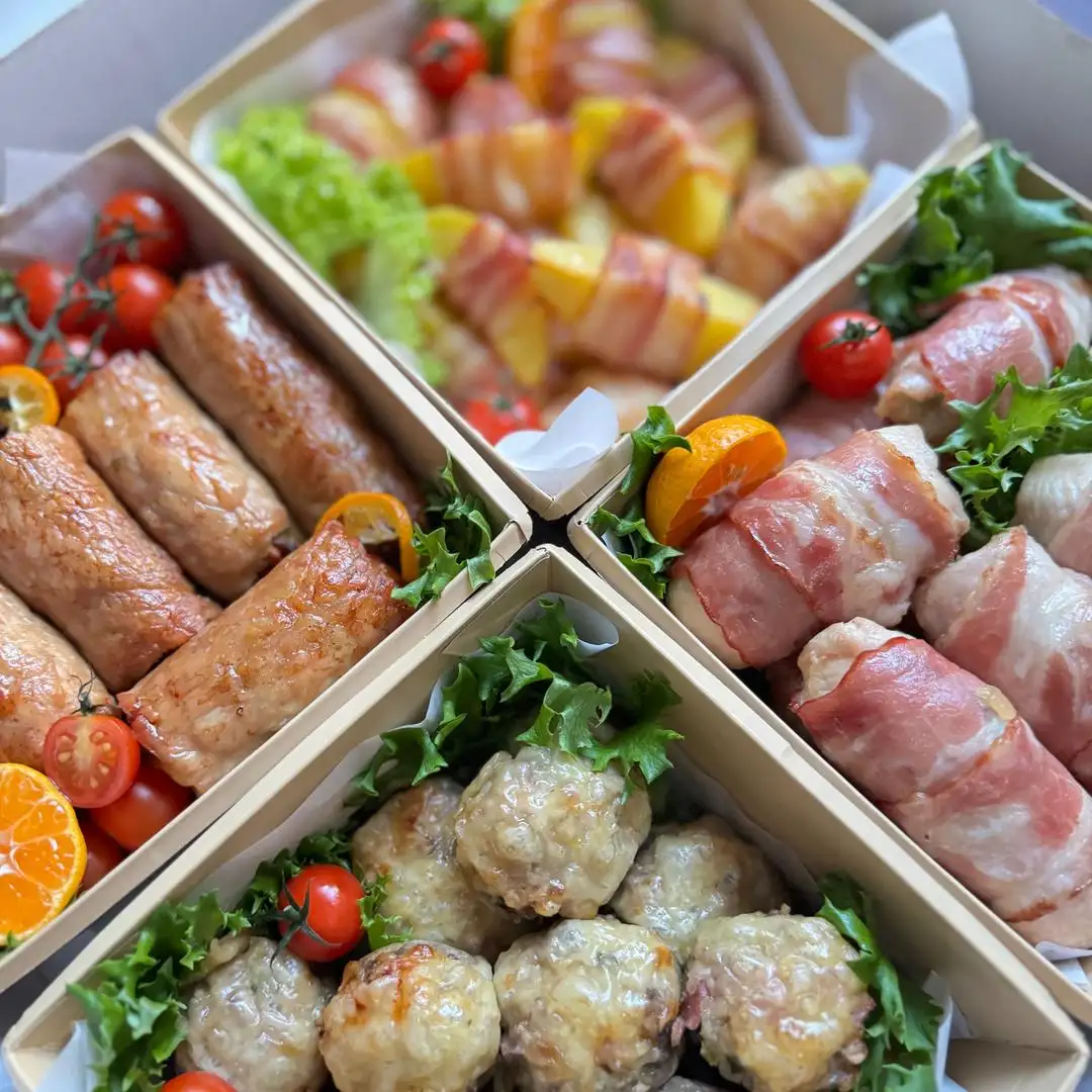 Идеальное решение! Рулетики из куриного филе с сыром и шпинатом в беконе — 12 шт Мясо по-французски в виде рулетиков — 12 шт Фаршированные шампиньоны- 15 шт Картофельные дольки по-деревенски — 30 шт Вес 4 кг На 10−12 персон Бокс доступен к заказу в готовом и сыром виде! Готовый — 350 руб Сырой — 300 руб