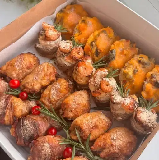 Свинина с начинкой (болгарский перец и чернослив) под сырной шапочкой Рулетики из хека с начинкой и креветками (Форель, шампиньоны, творожный сыр) Рулетики из бедрышек фаршированные шампиньонами и сыром Фаршированные куриные голени в беконе (сыр, зелень, майонез)