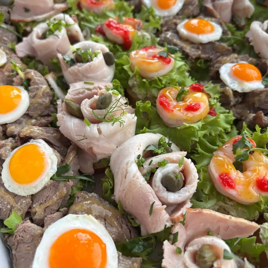 Основа состоит из хрустящего багета. Мало хлеба — много начинки! Тапас с говядиной под медово-горчичным соусом с перепелиным яйцом — 12 шт Тапас с беконом на соусе релиш — 12 шт Тапас с муссом из авокадо с креветкой — 12 шт