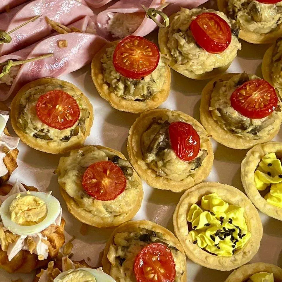 Состав: - тарталетки песочная - курица филе - шампиньоны - лук - сливки - майонез - сыр - помидор - черри