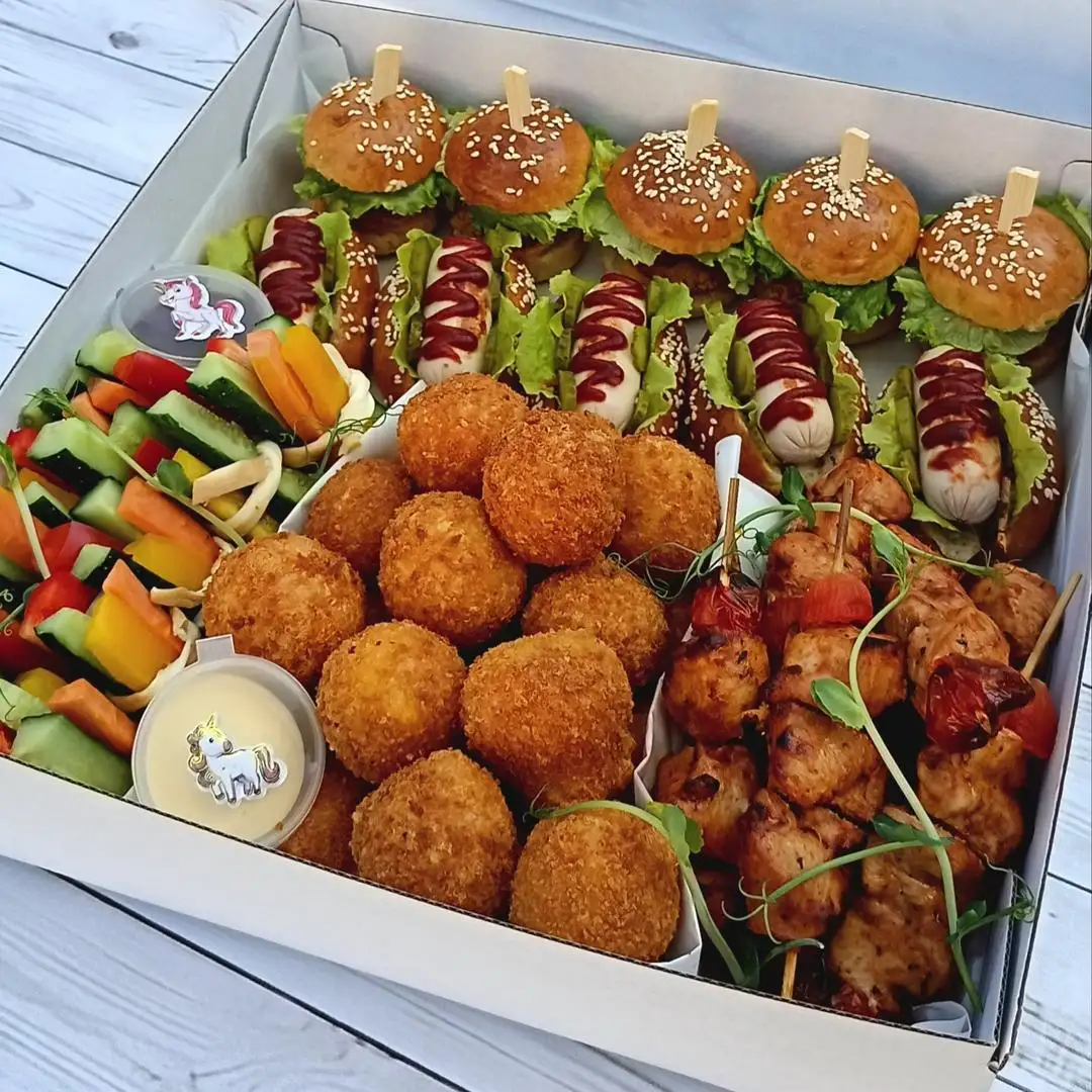 мини-бургер — 5 шт мини-хот-дог — 5 шт куриные шашлычки — 10 шт сырные шарики — 25 шт овощные карандаши — 10 шт соусы на выбор: сырный, кетчуп, сливочно-чесночный, кисло-сладкий