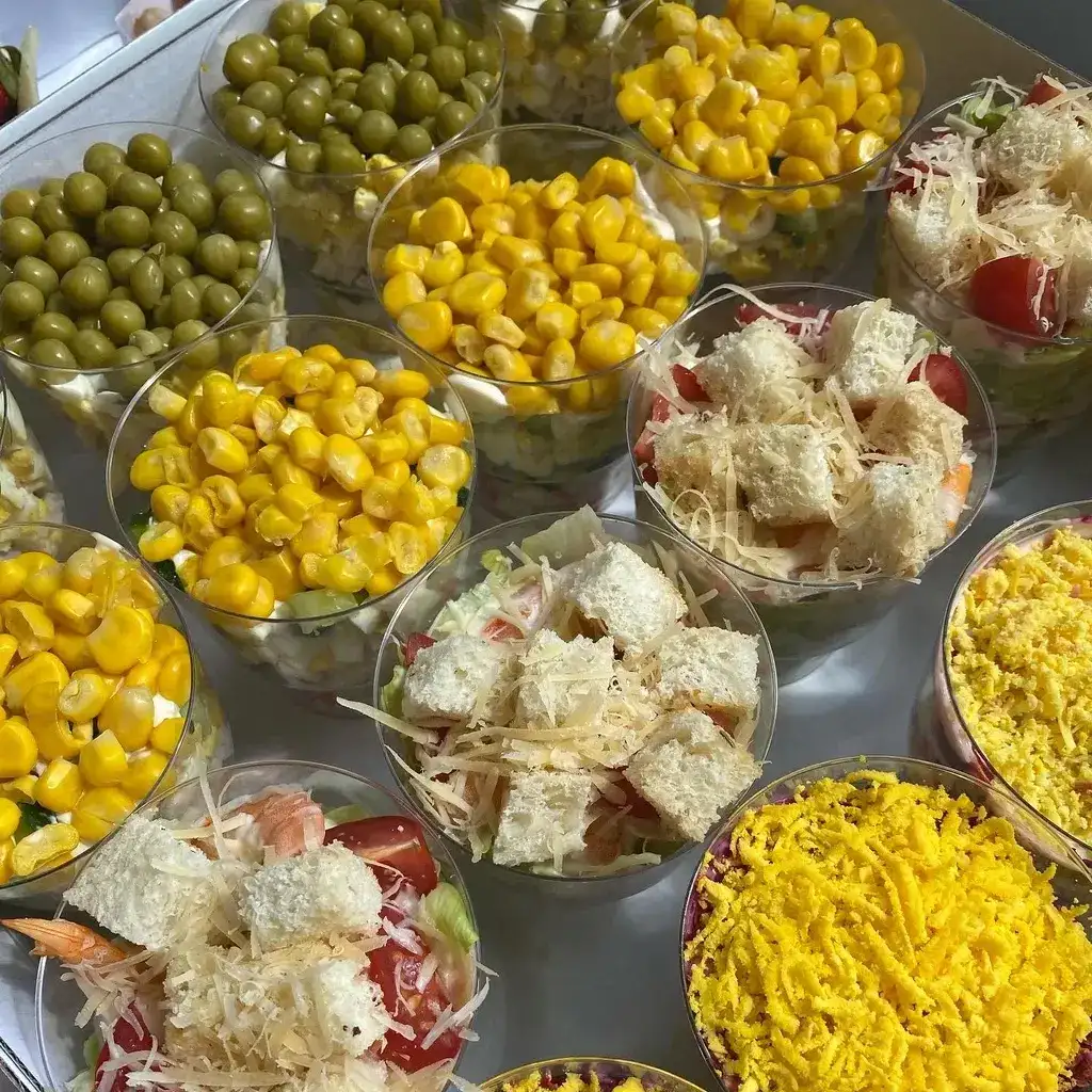 Салат «оливье с курицей Салат с кукурузой и крабовыми палочками Салат сельдь под шубой Салат цезарь c креветкой