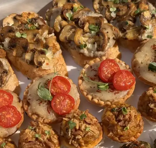 Брускетта с картофельно-трюфельным муссом и грибами, 5 шт Жульен в тарталетках а-ля Карбонара с трюфелем под сыром с пармезаном, 5 шт Грибной риет с сушеным луком в тарталетках, 8 шт. Сырный трюфель с вялеными томатами , пармезаном и зеленью, 8 шт Сладкий сырный трюфель с медом, вялеными вишней и клюквой, с курагой и орешками, 8 шт