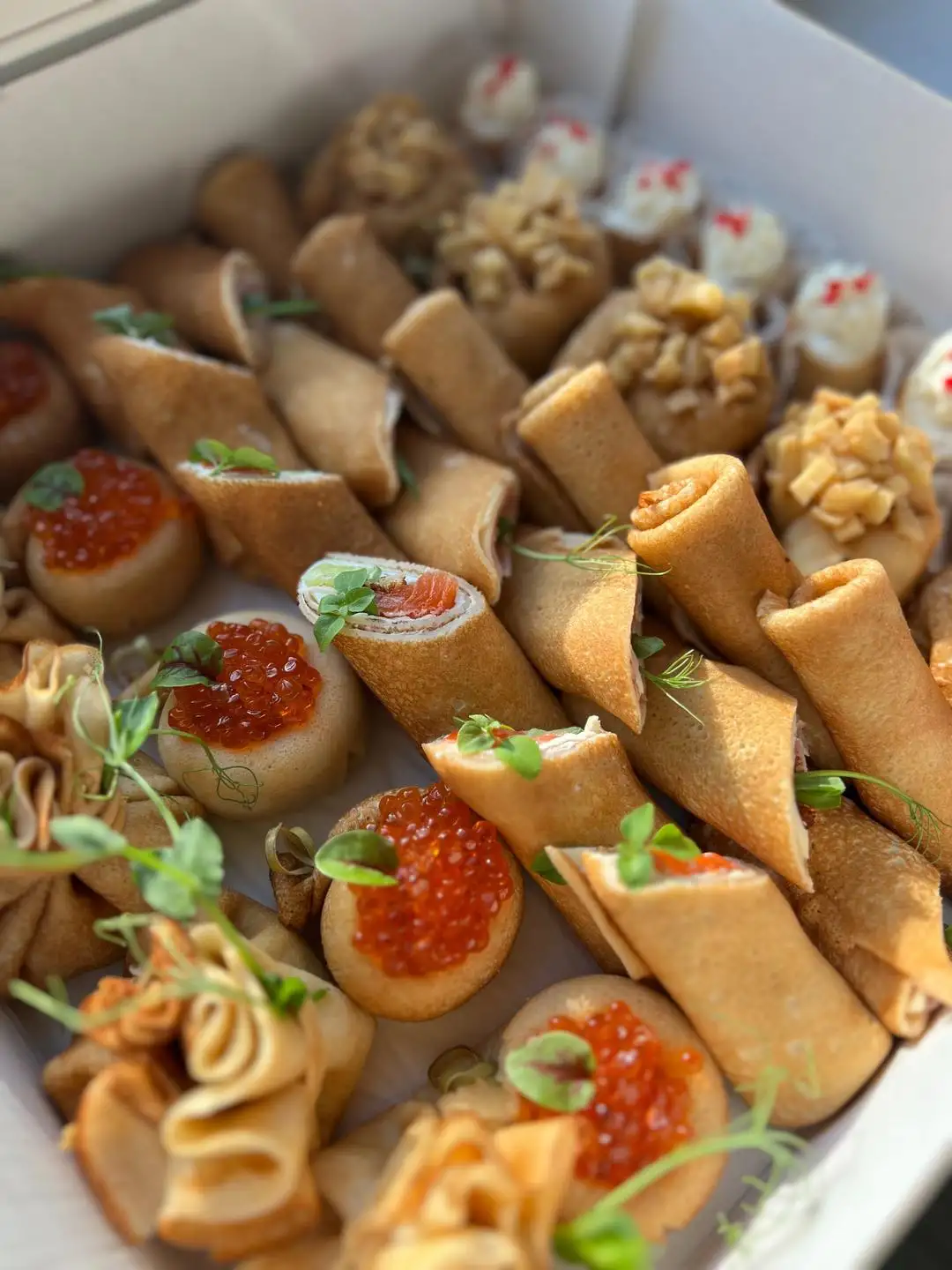Блины с жульеном 5 шт Блины с икрой 5 шт Блины с карбонадом и сыром 6 шт Блины с рыбой и огурцом 6 шт Блинчики пустые 6 шт Блины с яблоком 5 шт Блины с творогом 8 шт