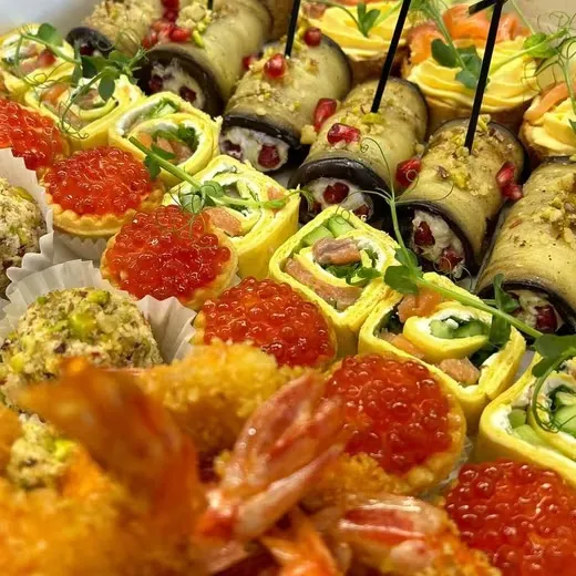Бокс из 45 закусок Состоит из : - рулетитики из баклажан с пикантной начинкой 7шт - рулетики из тортильи с красной рыбой и огурцом 7шт - тарталетки с красной икрой 7шт - кростини с сырно-яичным муссом и красной рыбой 7шт -чиз-болы( сырные шарики с виноградом) в ореховой панировке 7шт - лангустины в сухарях панко 10шт