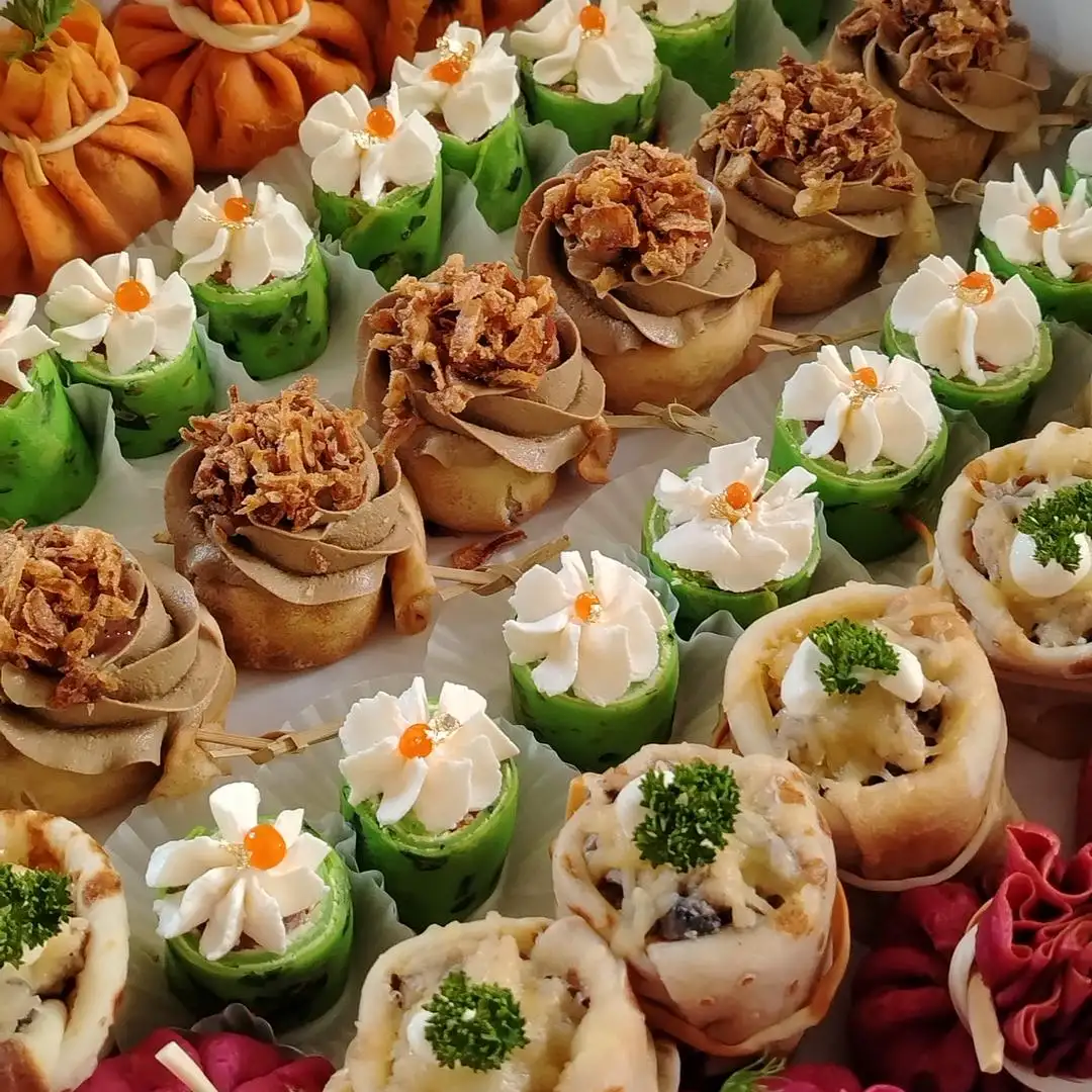 Блинчики свекольные с сельдочкой — 7 шт Блинчики морковные с копчёной курицей и грибами — 7 шт Корзинка с жульеном — 7 шт Блинчики шпинатные с форелью — 16 шт Блинчики с печёночным муссом — 6 шт