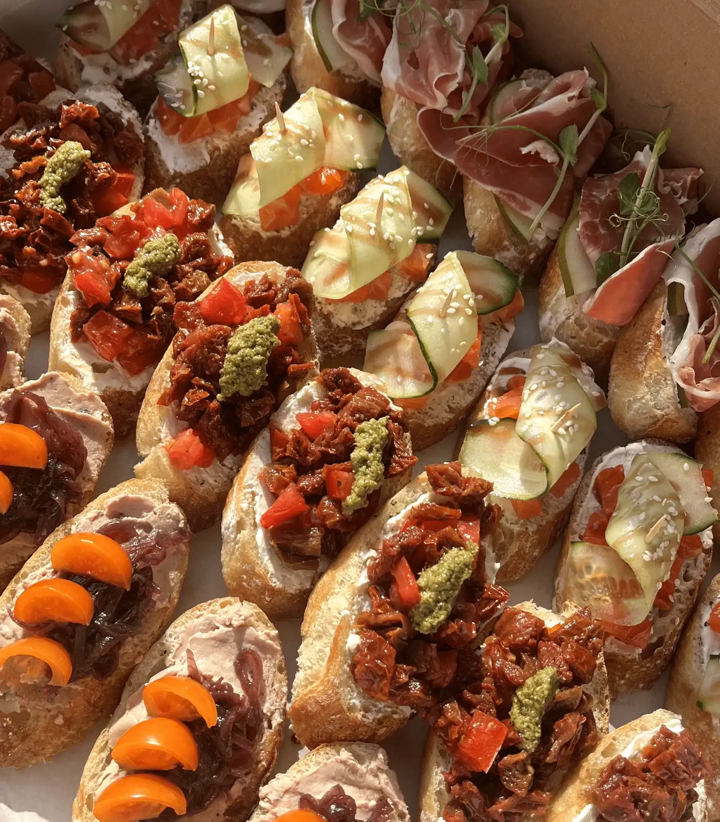 Cостав: Брускетта с прошутто и грушей Брускетта с тар-таром из лосося с огурчиком Брускетта с вялеными/свежими томатами и песто Брускетта с фуа-гра м луковый мармелад Стоимость: М — 108 р Сет на компанию из 2-3 человек Вес: 800 г — 16 шт L — 129 р Сет на компанию из 3-4 человека Вес: 1200 г — 24 шт XL — 146 р Сет на компанию из 5-6 человек Вес: 1600 г — 32 шт
