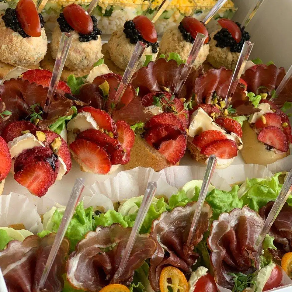 — Монетка с икрой — 6 шт. — Брускетта с клубникой, хамоном и сыром «Бри» — 6 шт. — Яично-сырный салатик — 6 шт. — Кабачковый бисквит с творожным сыром и хамоном — 7 шт.