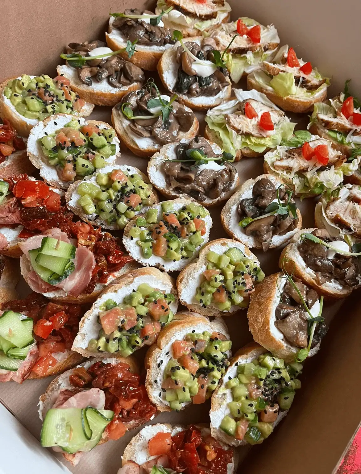 Cостав: Брускетта с жареным беконом и вялеными томатами Брускетта с тар-таром из лосоя, авокадо, огурчика в ореховом соусе Брускетта из ассорти жареных грибов с соусом Терияки Брускетта «Цезарь» с филе куриным Стоимость: М — 106 р Сет на компанию из 2-3 человек Вес: 850 г — 16 шт L — 127 р Сет на компанию из 3-4 человека Вес: 1250 г — 24 шт XL — 144 р Сет на компанию из 5-6 человек Вес: 1650 г — 32 шт