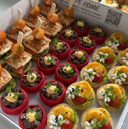 1. Канапе на слоеном тесте с форелью 10 штук 2. Тарталетти с говядиной 10 штук 3. Тарталетки с креветками 10 штук