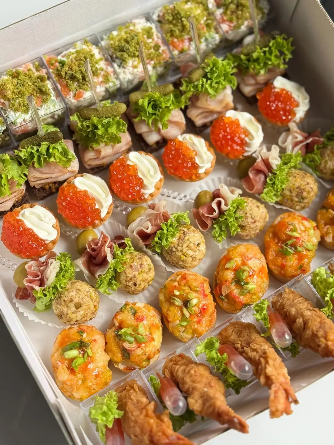 «Чизкейк» с форелью — 6 шт Канапе с беконом и корнишоном — 6 шт Тарталетки с икрой — 6 шт Канапе с хамоном — 6 шт Кростини с запеченным лангустином и крабом — 6 шт Лангустины панко с соусом — 6 шт