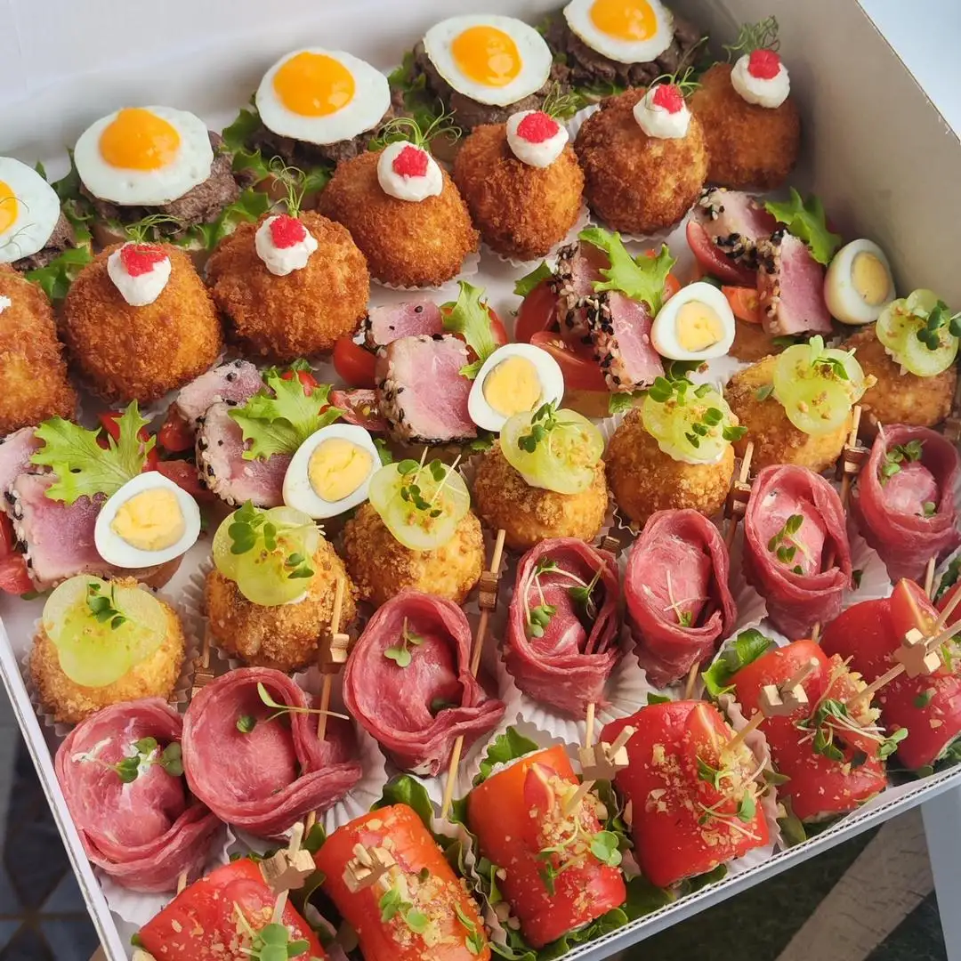 Состоит из: — тапас с говядиной и медово-горчичным соусом, 5 шт — картофельные шарики, 7 шт — тапас с тунцом, 5 шт — чиз болл с виноградом, 7 шт — пельмешки закусочные, 7 шт — рулетики из перца, 7 шт