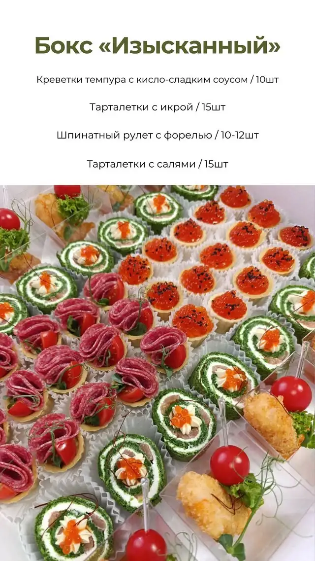 Набор для гурманов, объединяющий лучшие деликатесы: хрустящие креветки темпура с соусом, нежные тарталетки с икрой, оригинальный шпинатный рулет с форелью и пикантные тарталетки с салями. Состав: креветки темпура с соусом (10шт), тарталетки с икрой (15шт), шпинатный рулет с форелью (10-12шт), тарталетки с салями (15шт).