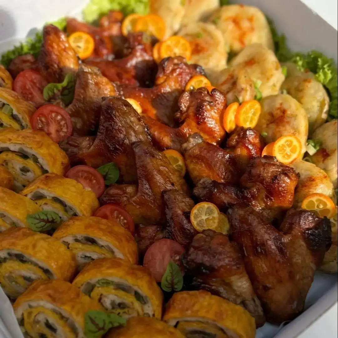 • крылышки карамелизированные ~13 шт • рулет сырный с грибами и мясом ~14 шт • картофельные лодочки с беконом и сыром ~12 шт