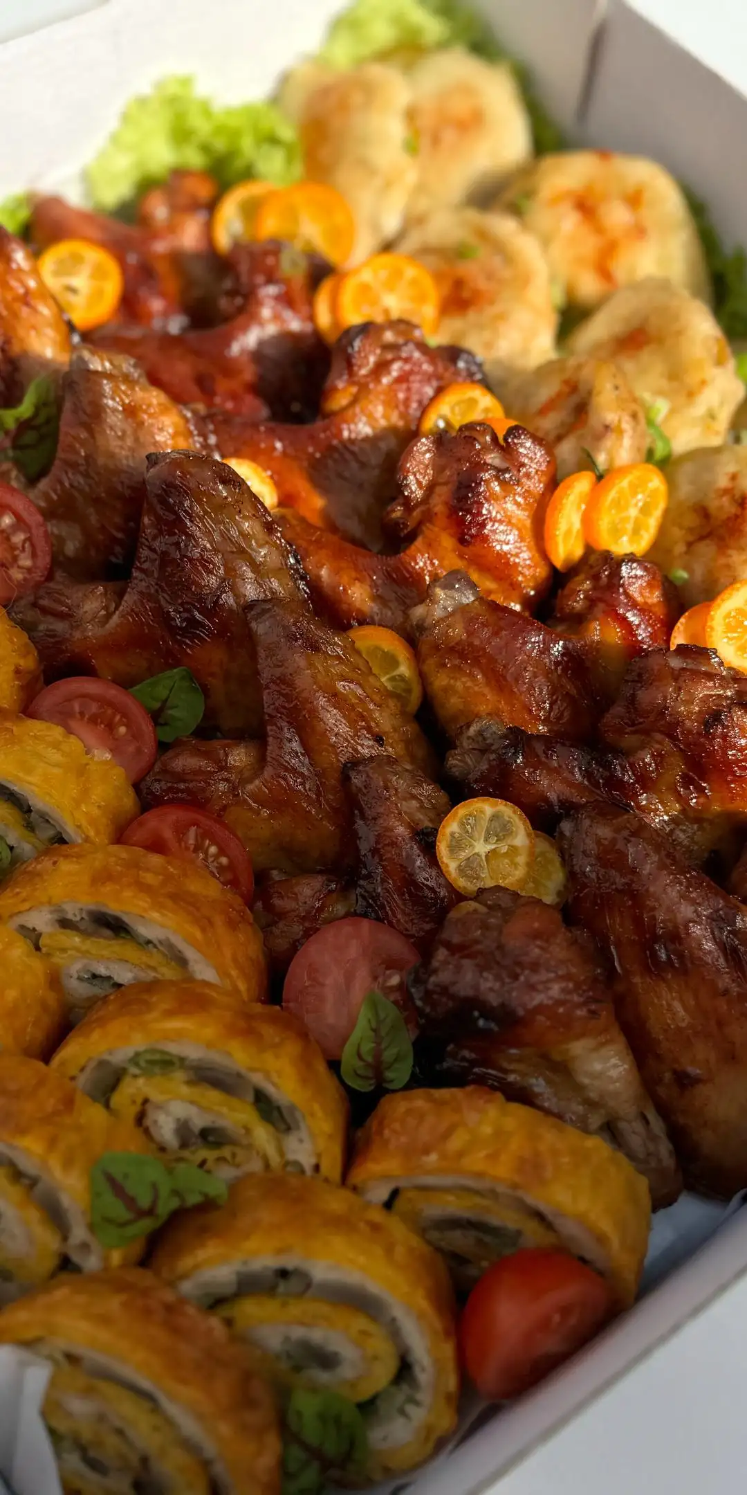 Рулет «Сырный с грибами и мясом» 12 шт. Крылышки в соусе 12 шт. Картофельные лодочки 12 шт.