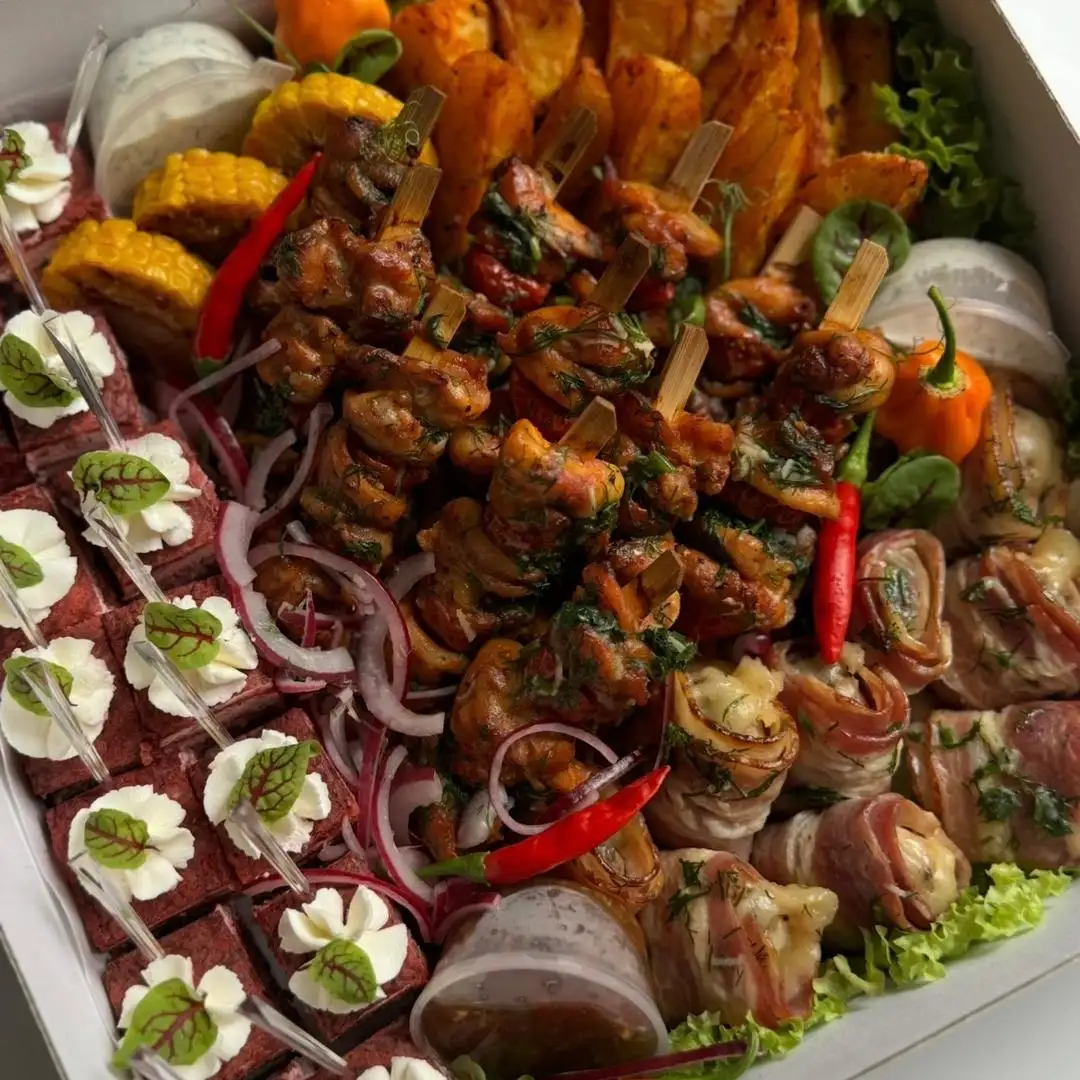 • мини-шашлычки куриные ~11 шт • канапе свекольные с сельдью ~14 шт • картофель по-деревенски ~430 гр • грибы в беконе ~11 шт + 3 соуса