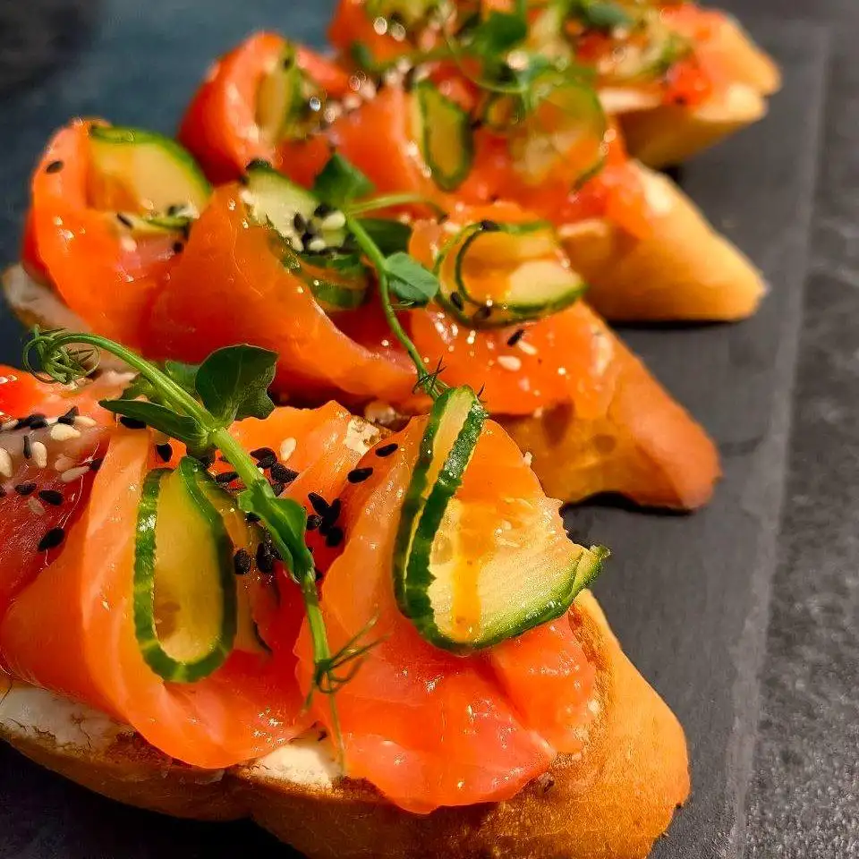 На выбор: — Брускетта с муссом из форели и икрой — Брускетта с курочкой терияки — Брускетта с вяленым балыком и шпинатным муссом — Брускетта с форелью и огурцом Заказ от 10 штук