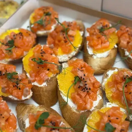 На выбор: — Брускетта с форелью и апельсином — Брускетта с тар-таром из форели с авокадо и луком — Брускетта с форелью слабосоленой и свежим огурцом Заказ от 10 штучек.