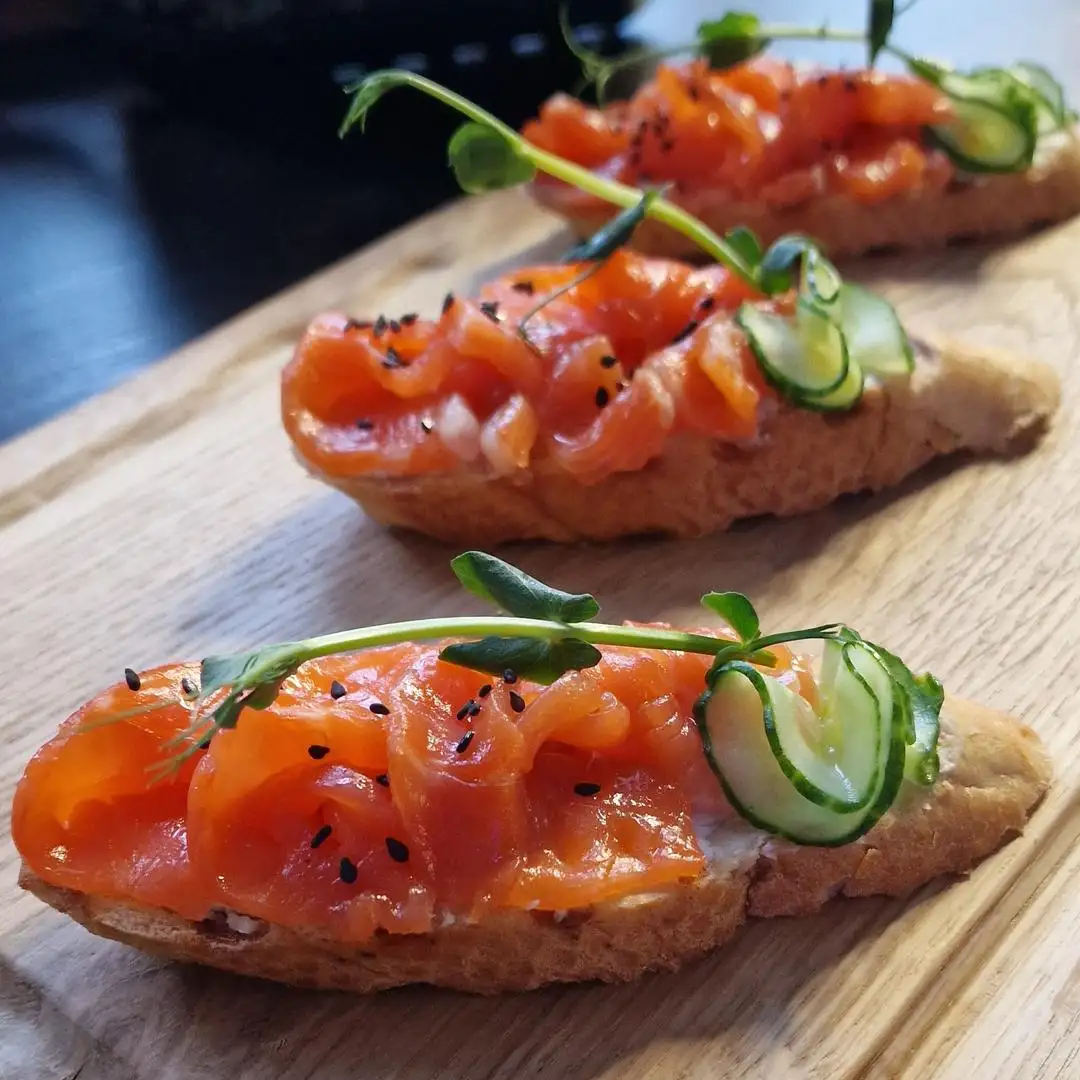 Состав: багет, творожный сыр, форель, огурец.