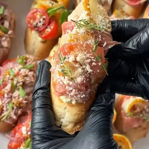 Багет, творожный сыр, сырокопченое мясо, груша , сыр пармезан